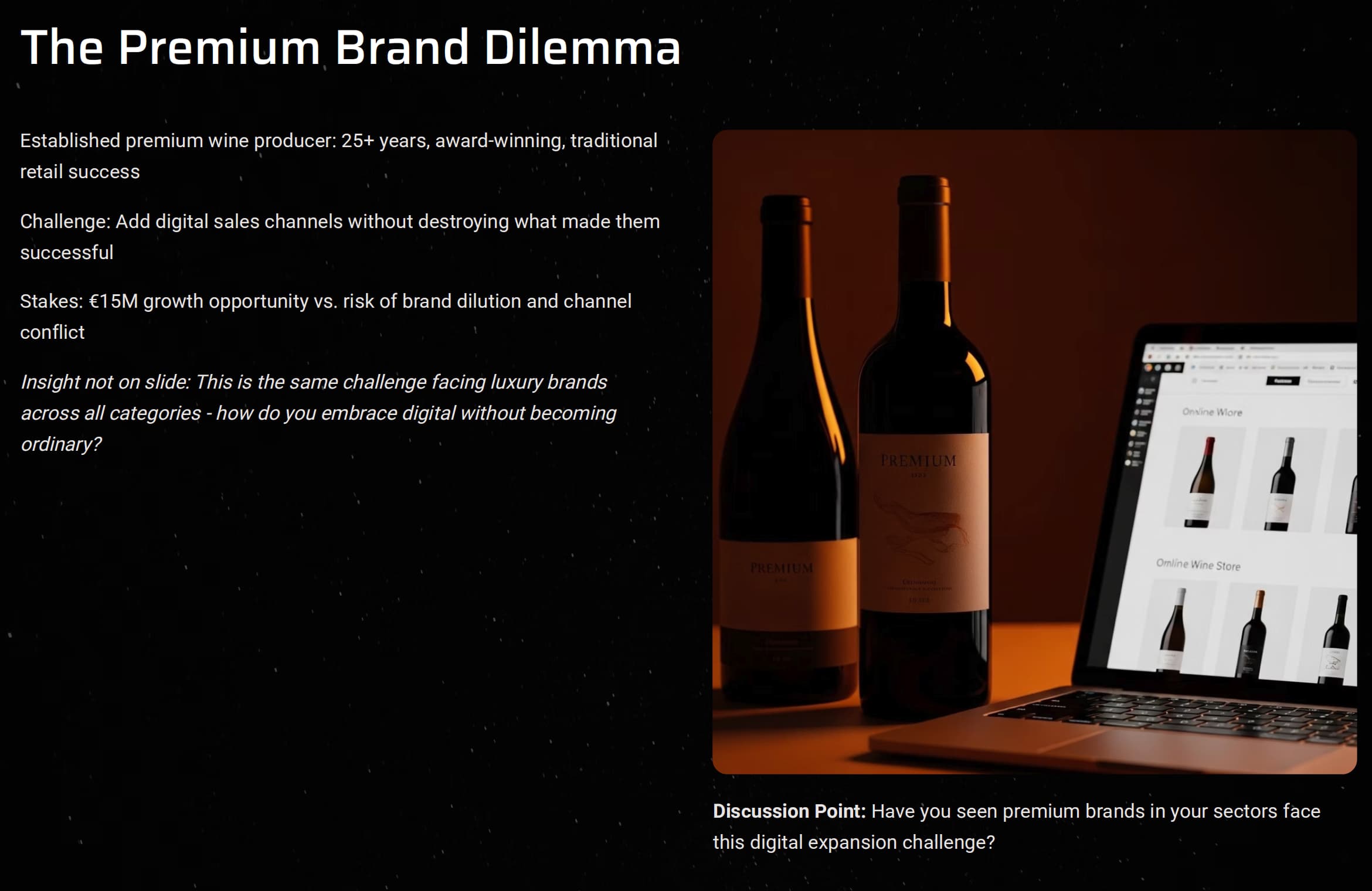 This isn’t just about wine. It’s the same challenge facing every premium brand today. Luxury fashion houses are questioning direct-to-consumer strategies. High-end consultancies evaluating online service delivery. Boutique manufacturers are considering e-commerce platforms.
