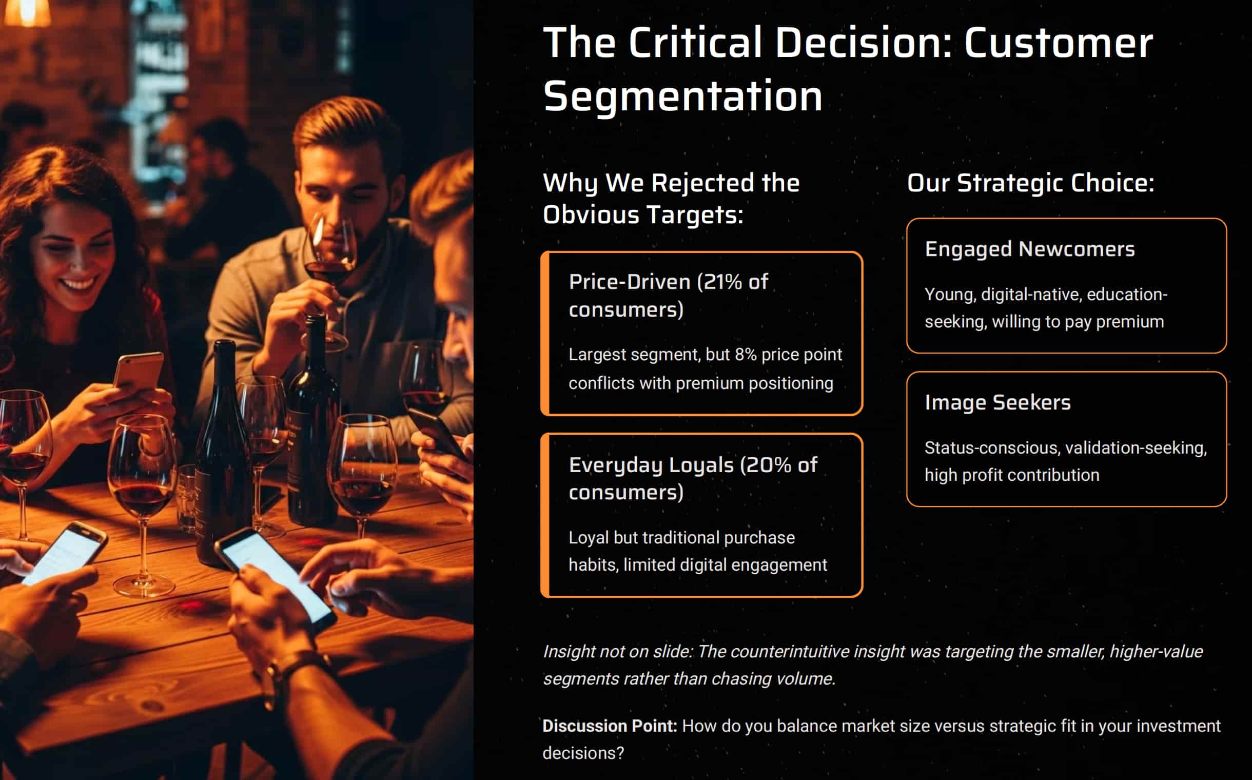 This proved to be the most critical decision. Using established consumer segmentation frameworks, we identified two primary targets whilst deliberately rejecting the obvious choices: