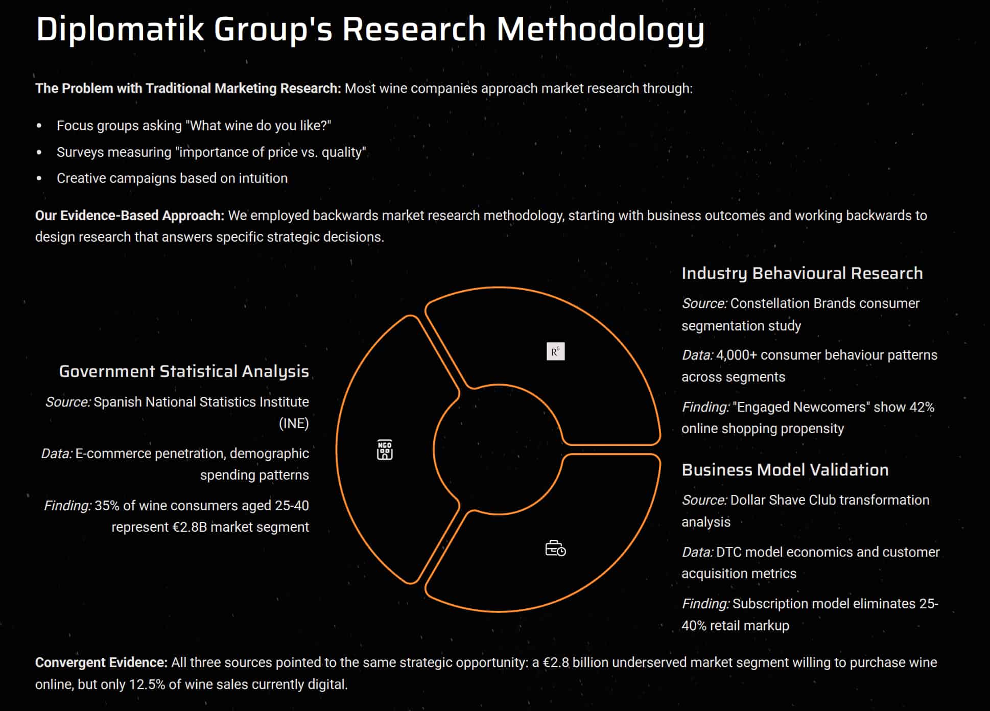 All three sources pointed to the same strategic opportunity: a €2.8 billion underserved market segment willing to purchase wine online, but only 12.5% of wine sales were currently digital.