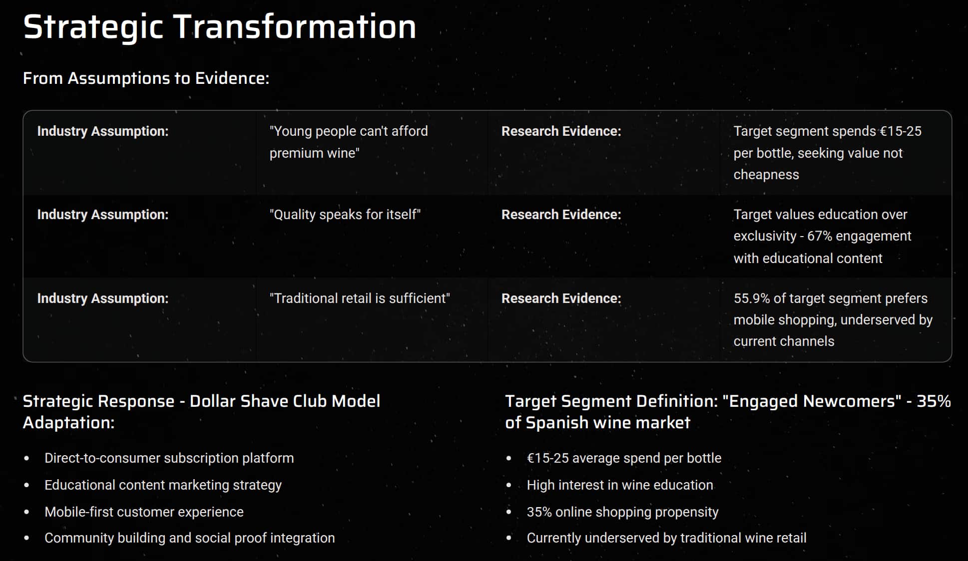 Industry Assumption: “Young people can’t afford premium wine” Research Evidence: Target segment spends €15-25 per bottle, seeking value, not cheapness