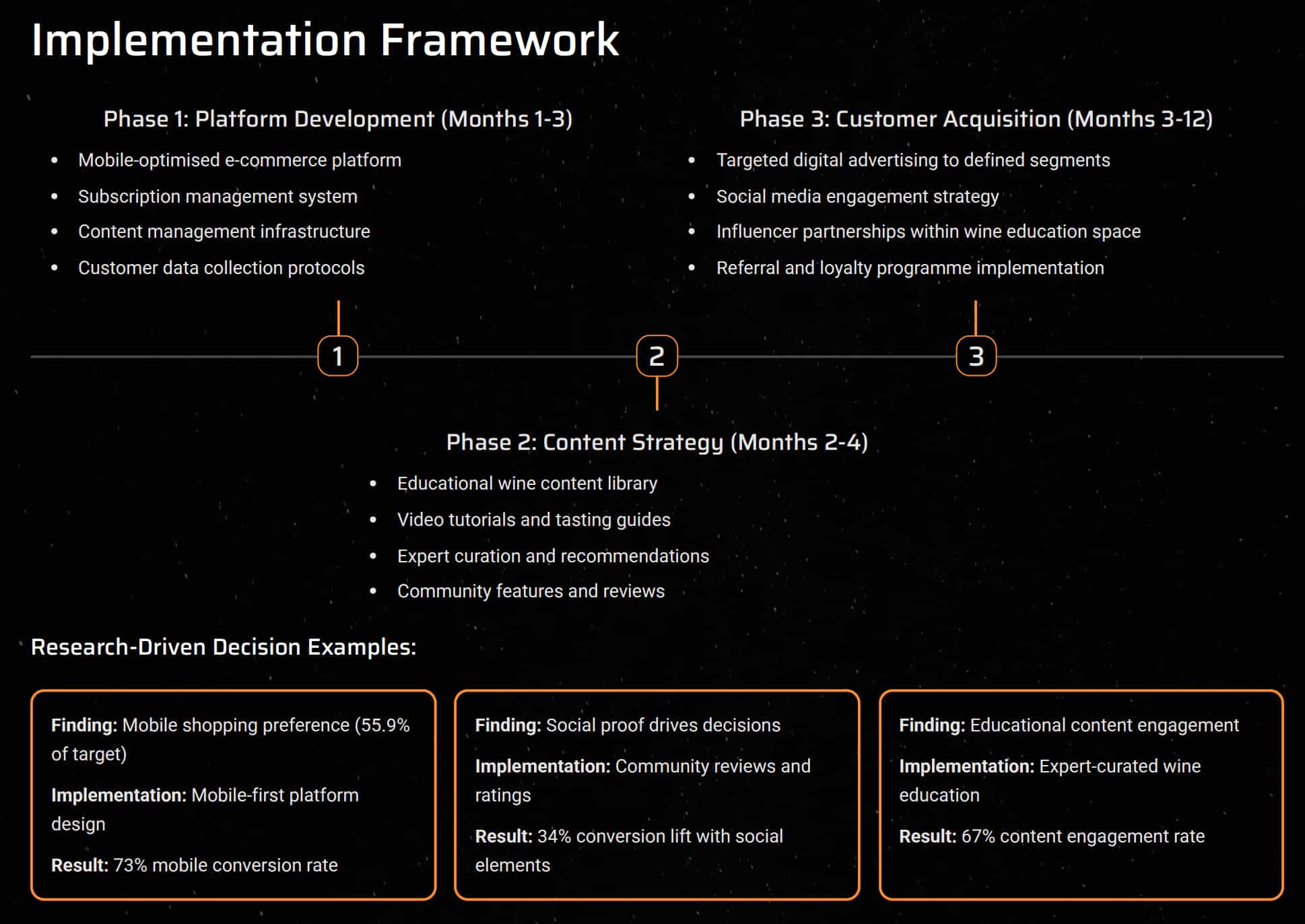 Every decision is traced directly back to research findings. When evidence showed a 55.9% mobile shopping preference, we implemented a mobile-first platform design. When research revealed social proof drives decisions, we integrated community reviews and ratings. When data demonstrated educational content engagement, we developed expert-curated wine education.