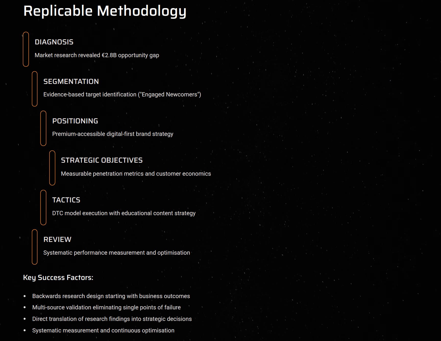 This distinction is crucial. Most companies jump straight to tactical solutions—creative campaigns, price promotions, influencer partnerships. We began with systematic research to eliminate assumptions and base every strategic decision on validated evidence.